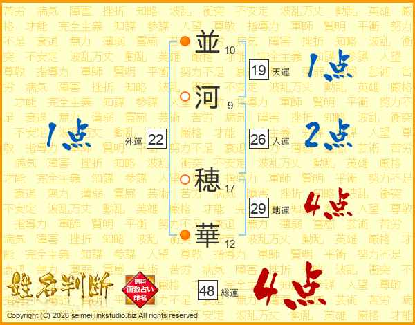 生活面を象徴する運勢です。外部から受ける影響力を表し、結婚運、家庭運や職場、環境への順応性を表します。総運から人運を引いた画数。姓や名が1文字の場合を除く。