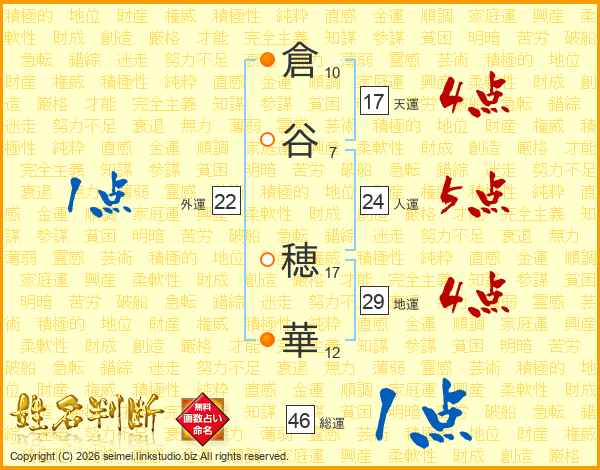 倉谷穂華さんの地運は29画の4点!