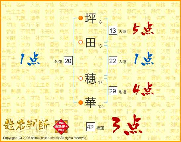 生活面を象徴する運勢です。外部から受ける影響力を表し、結婚運、家庭運や職場、環境への順応性を表します。総運から人運を引いた画数。姓や名が1文字の場合を除く。