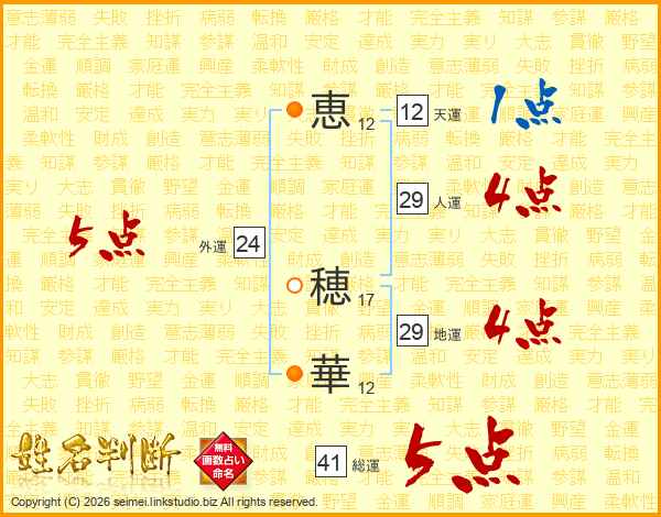 生活面を象徴する運勢です。外部から受ける影響力を表し、結婚運、家庭運や職場、環境への順応性を表します。総運から人運を引いた画数。姓や名が1文字の場合を除く。