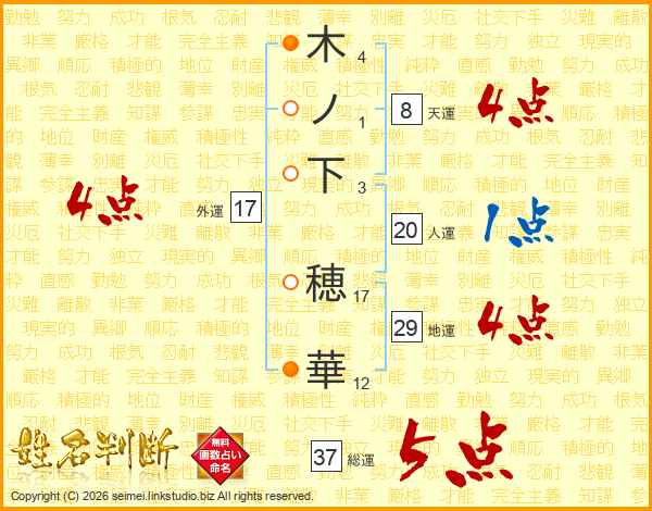 木ノ下穂華さんの総運は37画の5点!