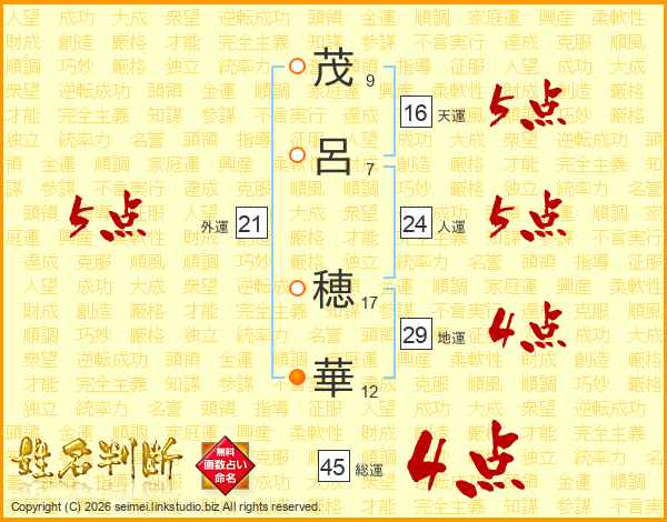 茂(9画)呂(7画) 穂(17画)華(12画)