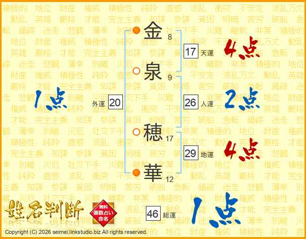 金(8画)泉(9画) 穂(17画)華(12画)