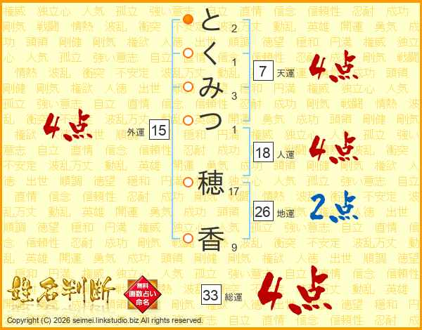 と(2画)く(1画)み(3画)つ(1画) 穂(17画)香(9画)