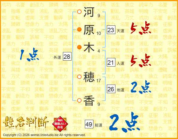 河(9画)原(10画)木(4画) 穂(17画)香(9画)
