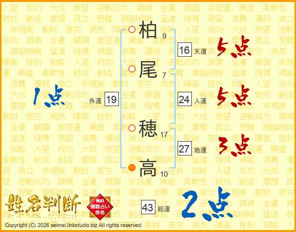 柏(9画)尾(7画) 穂(17画)高(10画)