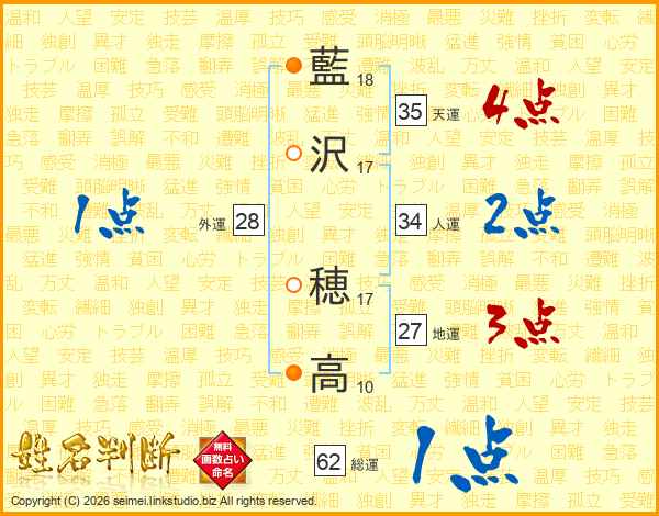 藍(18画)沢(17画) 穂(17画)高(10画)