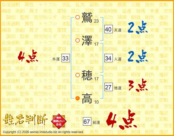鷲(23画)澤(17画) 穂(17画)高(10画)