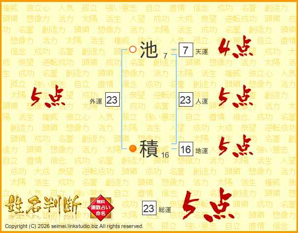 生活面を象徴する運勢です。外部から受ける影響力を表し、結婚運、家庭運や職場、環境への順応性を表します。総運から人運を引いた画数。姓や名が1文字の場合を除く。