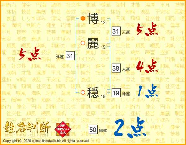 生活面を象徴する運勢です。外部から受ける影響力を表し、結婚運、家庭運や職場、環境への順応性を表します。総運から人運を引いた画数。姓や名が1文字の場合を除く。