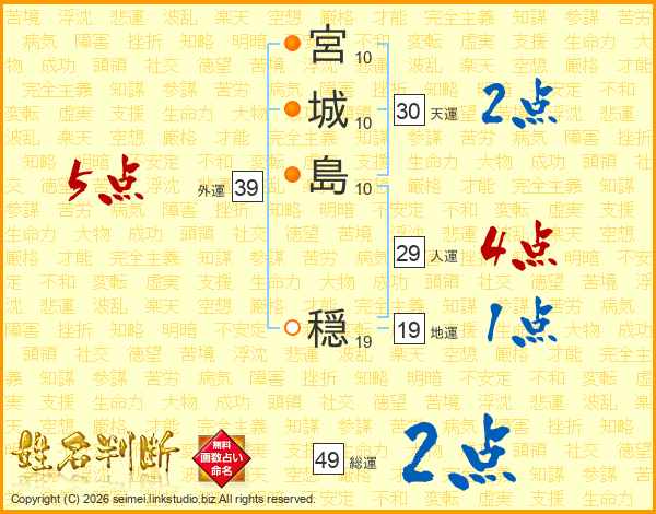 生活面を象徴する運勢です。外部から受ける影響力を表し、結婚運、家庭運や職場、環境への順応性を表します。総運から人運を引いた画数。姓や名が1文字の場合を除く。