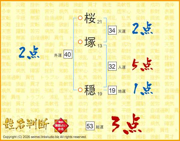 桜塚穏さんの総運は53画の3点!