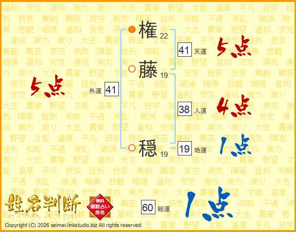 生活面を象徴する運勢です。外部から受ける影響力を表し、結婚運、家庭運や職場、環境への順応性を表します。総運から人運を引いた画数。姓や名が1文字の場合を除く。
