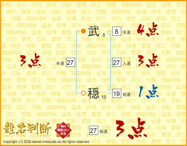 生活面を象徴する運勢です。外部から受ける影響力を表し、結婚運、家庭運や職場、環境への順応性を表します。総運から人運を引いた画数。姓や名が1文字の場合を除く。