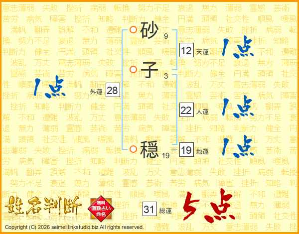 砂子穏さんの総運は31画の5点!