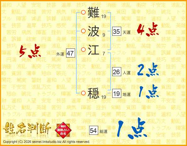 生活面を象徴する運勢です。外部から受ける影響力を表し、結婚運、家庭運や職場、環境への順応性を表します。総運から人運を引いた画数。姓や名が1文字の場合を除く。