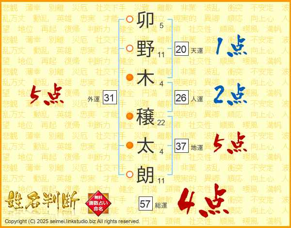 卯(5画)野(11画)木(4画) 穣(22画)太(4画)朗(11画)
