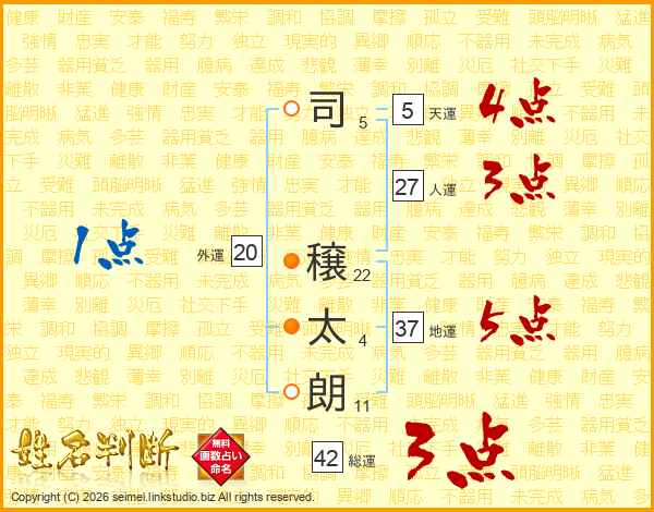 生活面を象徴する運勢です。外部から受ける影響力を表し、結婚運、家庭運や職場、環境への順応性を表します。総運から人運を引いた画数。姓や名が1文字の場合を除く。