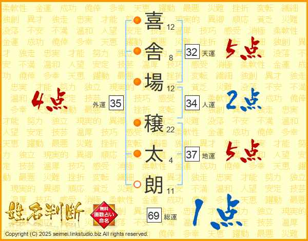 喜(12画)舎(8画)場(12画) 穣(22画)太(4画)朗(11画)