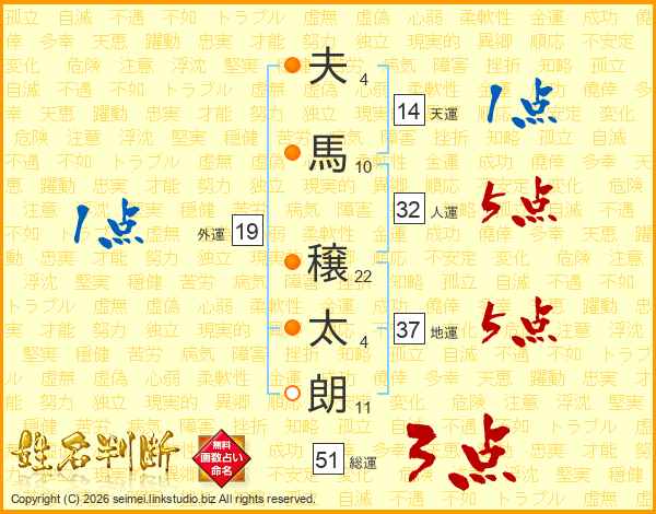 夫(4画)馬(10画) 穣(22画)太(4画)朗(11画)