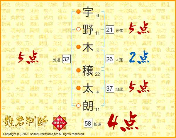 宇(6画)野(11画)木(4画) 穣(22画)太(4画)朗(11画)