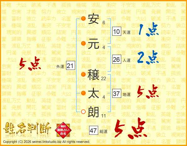 安(6画)元(4画) 穣(22画)太(4画)朗(11画)