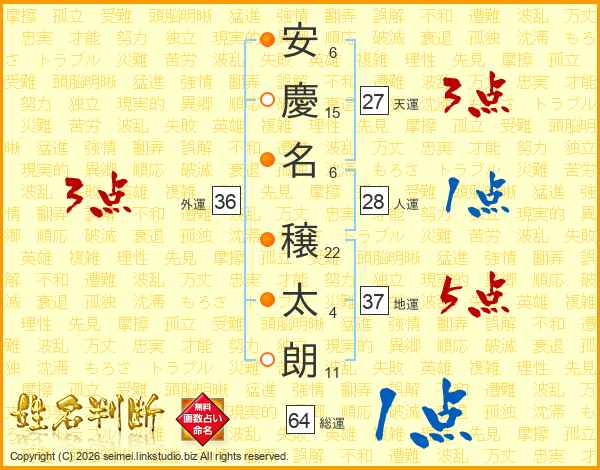 安(6画)慶(15画)名(6画) 穣(22画)太(4画)朗(11画)