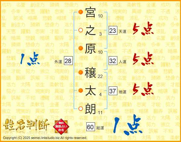 宮(10画)之(3画)原(10画) 穣(22画)太(4画)朗(11画)