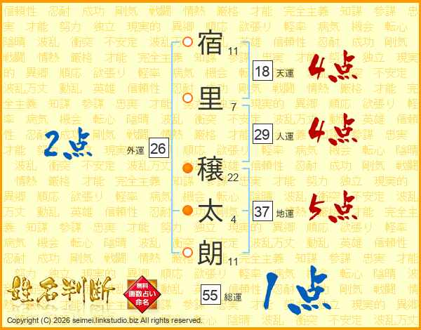 宿(11画)里(7画) 穣(22画)太(4画)朗(11画)