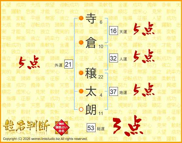 寺(6画)倉(10画) 穣(22画)太(4画)朗(11画)
