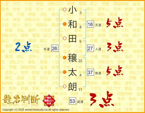 小(3画)和(8画)田(5画) 穣(22画)太(4画)朗(11画)