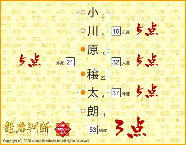 小(3画)川(3画)原(10画) 穣(22画)太(4画)朗(11画)