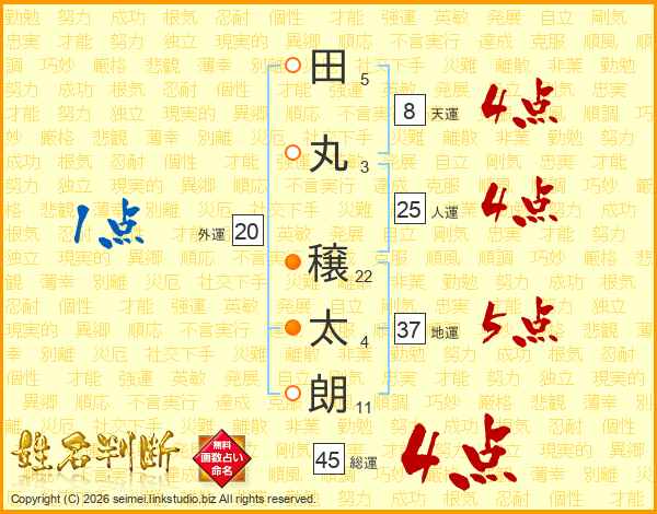 田(5画)丸(3画) 穣(22画)太(4画)朗(11画)