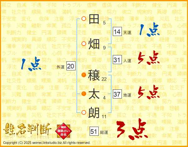 田(5画)畑(9画) 穣(22画)太(4画)朗(11画)