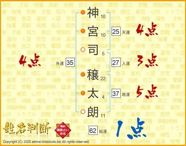 神(10画)宮(10画)司(5画) 穣(22画)太(4画)朗(11画)