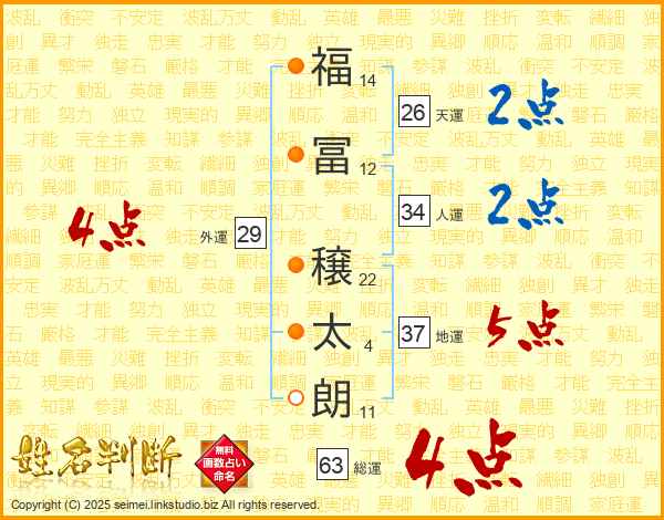 福(14画)冨(12画) 穣(22画)太(4画)朗(11画)