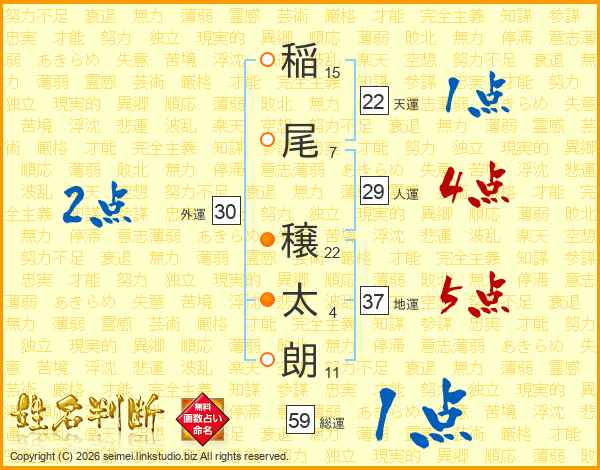 稲(15画)尾(7画) 穣(22画)太(4画)朗(11画)