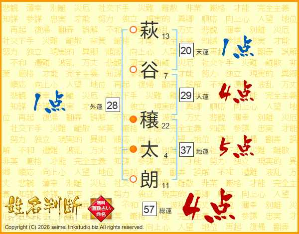 萩(13画)谷(7画) 穣(22画)太(4画)朗(11画)