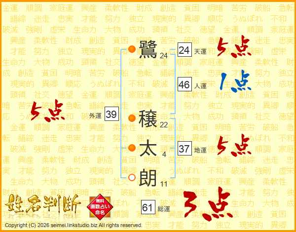 鷺穣太朗さんの総運は61画の3点!