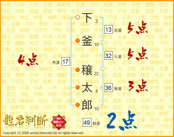 下釜穣太郎さんの天運は13画の5点!