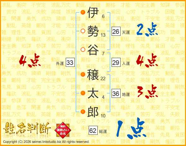 伊勢谷穣太郎さんの総運は62画の1点!