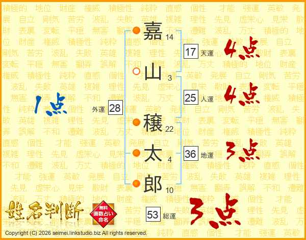 嘉(14画)山(3画) 穣(22画)太(4画)郎(10画)