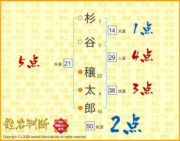 杉(7画)谷(7画) 穣(22画)太(4画)郎(10画)