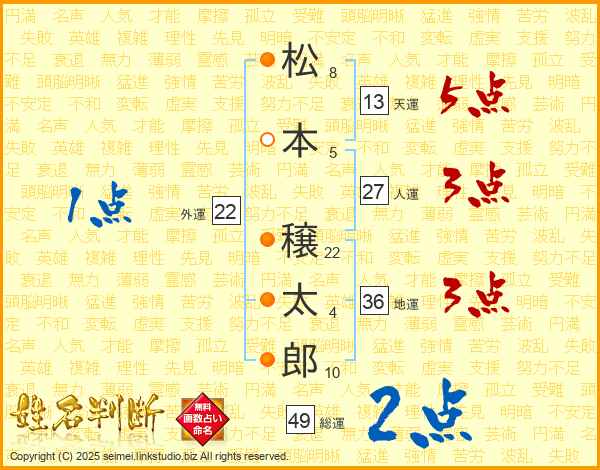 松(8画)本(5画) 穣(22画)太(4画)郎(10画)