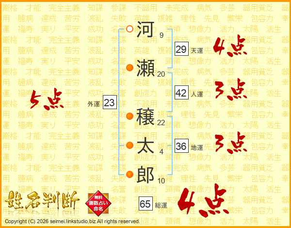 河瀬穣太郎さんの総運は65画の4点!