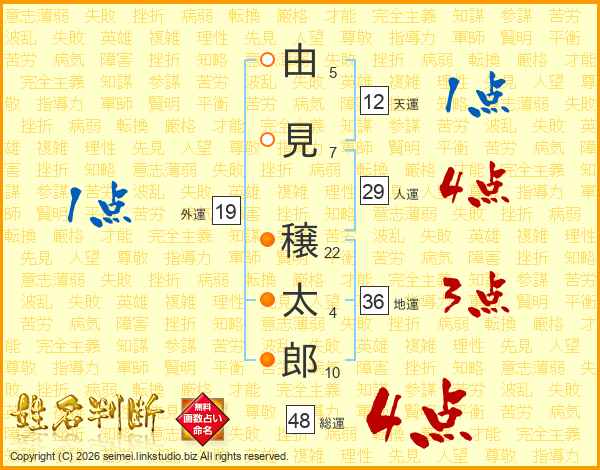 由(5画)見(7画) 穣(22画)太(4画)郎(10画)