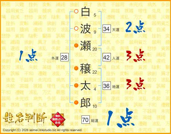 白(5画)波(9画)瀬(20画) 穣(22画)太(4画)郎(10画)