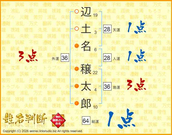 辺(19画)土(3画)名(6画) 穣(22画)太(4画)郎(10画)