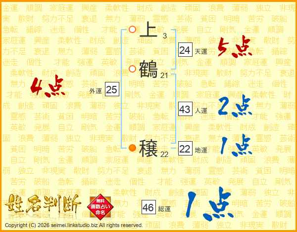 生活面を象徴する運勢です。外部から受ける影響力を表し、結婚運、家庭運や職場、環境への順応性を表します。総運から人運を引いた画数。姓や名が1文字の場合を除く。