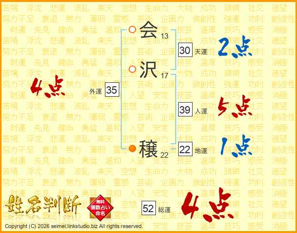 会沢穣さんの総運は52画の4点!